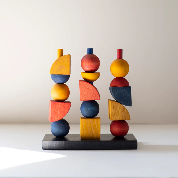 Inspiriert vom Bauhaus-Stil - verbindet die Einfachheit der Form mit Funktionalität. Je nach Lust und Laune können die Holzbausteine nach Farbe, nach Form oder nach einem eigenen Muster angeordnet werden.